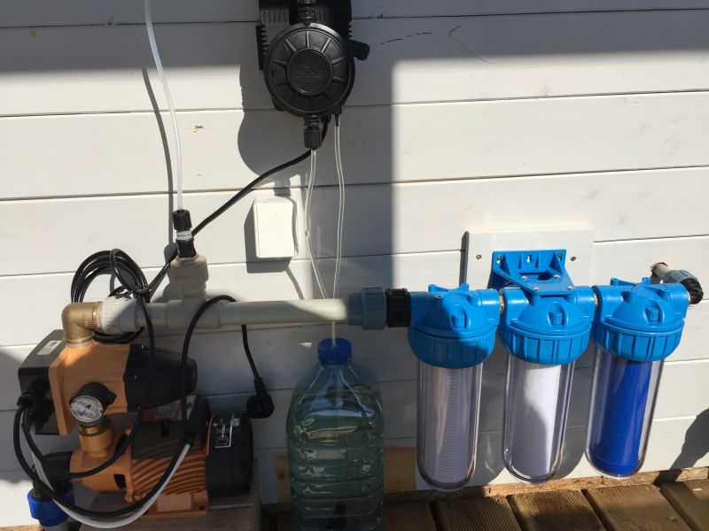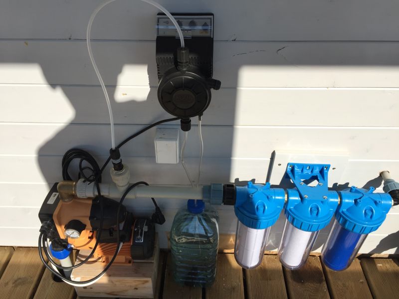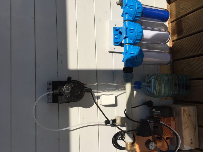 Dle rozboru vody nainstalováno dávkovací čerpadlo Aqua HC100 na odstranění bakterií a sestava filtrů na mechanické nečistoty a snížení Chsk aktivním uhlím v rekreačním domě v obci Vacov.